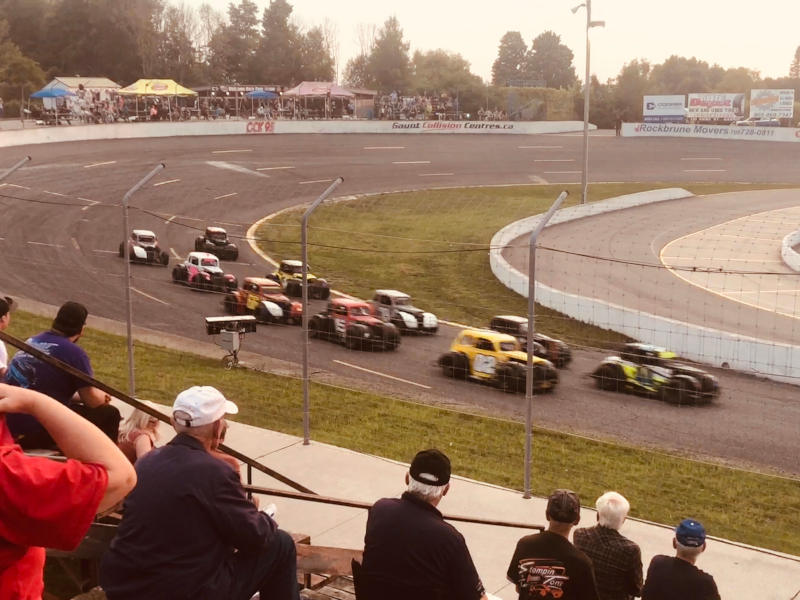 The next day, Bdot and her sister had an outing to Barrie for Yarnfest. I stayed with Bill and did yard work in the baking Sun. We were trying to clear a bunch of dead fall on the property. Nothing like carting wood in 30C heat to a fire. In the evening some of the men drove down to Innisfil to watch drag racing. This isn't something I would typically go to. I'm not really a big car guy. I'm even less of a watch car go around in circles car guy... but I thought it might be interesting. It certainly attracts a different demographic. Lots of camo and denim. I expect a ton to F Trudeau stickers on F-150s too...*shrug* Anyway... I didn't like the noise and smell so much but the event process and procedure was pretty interesting. There is quite a lot of formality (likely for safety) in how races are conducted. How things are quickly slowed down under a caution flag, how the car reform before they continue, all the crazy flag gestures by the flagman.